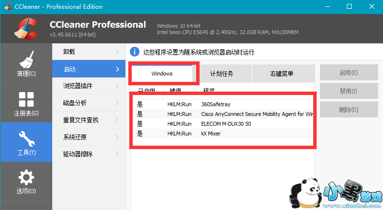 在界面右侧找到windows,这里会显示所有跟随开机自启的启动项,
