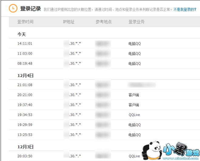 4、在这里可以查看近期的QQ登录记录,包括时间、ip地址、地点、登录业务等,假如出现异常的登录情况,那有可能出现被盗号的风险。