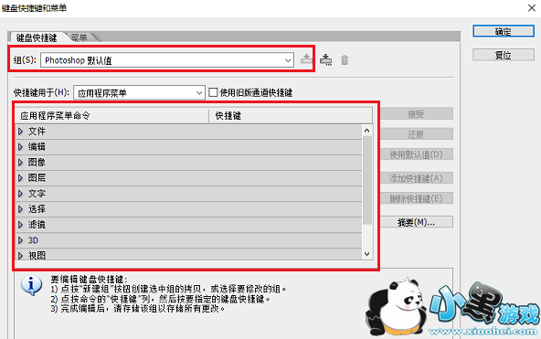 进去键盘快捷键和菜单界面,可以看到默认使用的PS快捷键,主要分为文件、编辑、图像、图层等快捷键设置,如下图所示: