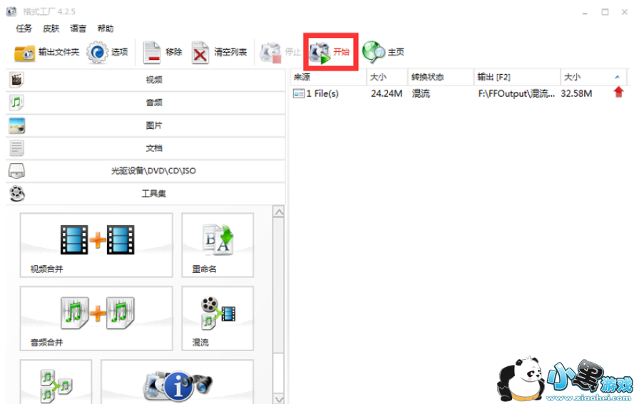 回到格式工厂主页,点击右侧的“开始”,等待混流输出完成就可以了。