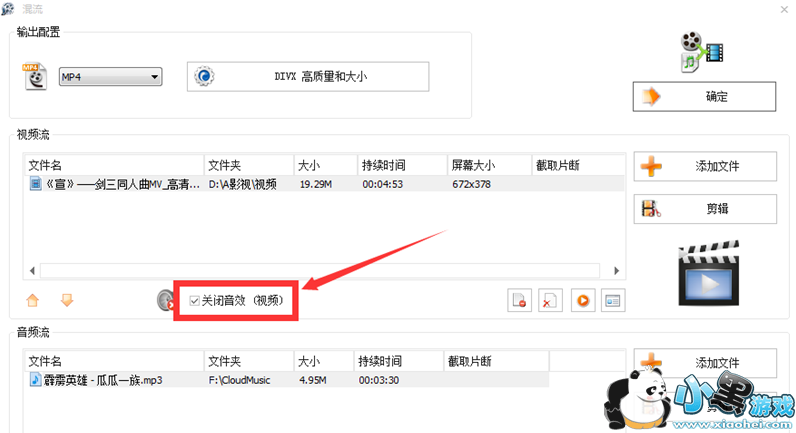 点击“视频流”文件名下方,取消勾选“关闭音效(视频)”,当然,你也可以选择不关闭;