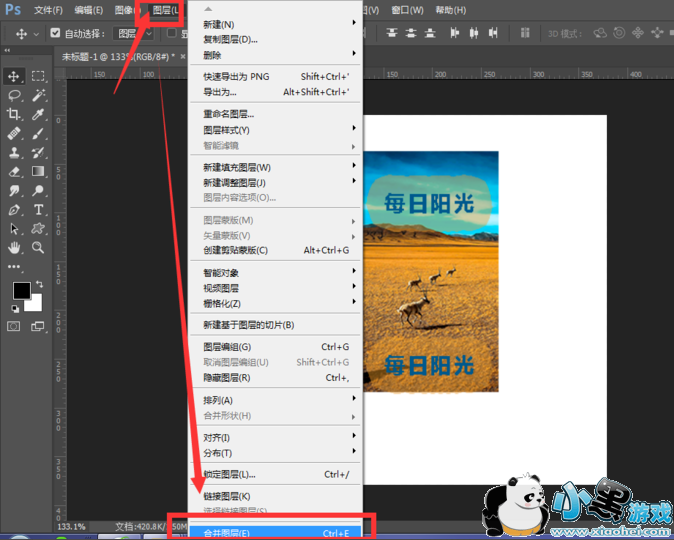 然后选择打开图层菜单栏,找到里面的合并图层【快捷键ctrl+e】,