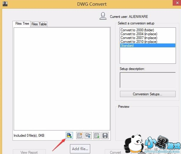 2、点击红色箭头指引处的图标,添加需要转化的高版本CAD文件(add file),双击添加文件或批量添加文件。