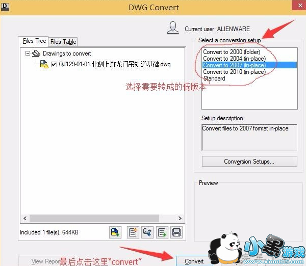 3、在“select a coversion setup”选择需要的转到的低版本,最后在底部点击覆盖"convert",出现读条。