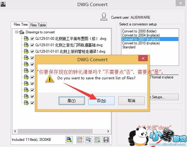 4、完成转换后点击“close”关闭DWG trueview,不需要保留转换清单的点“否”,需要保留点“是”。
