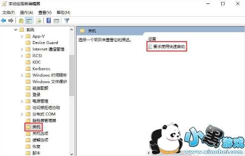 打开系统菜单,点击“关机”菜单项,在右侧窗口中找到并双击“要求使用快速启动”,