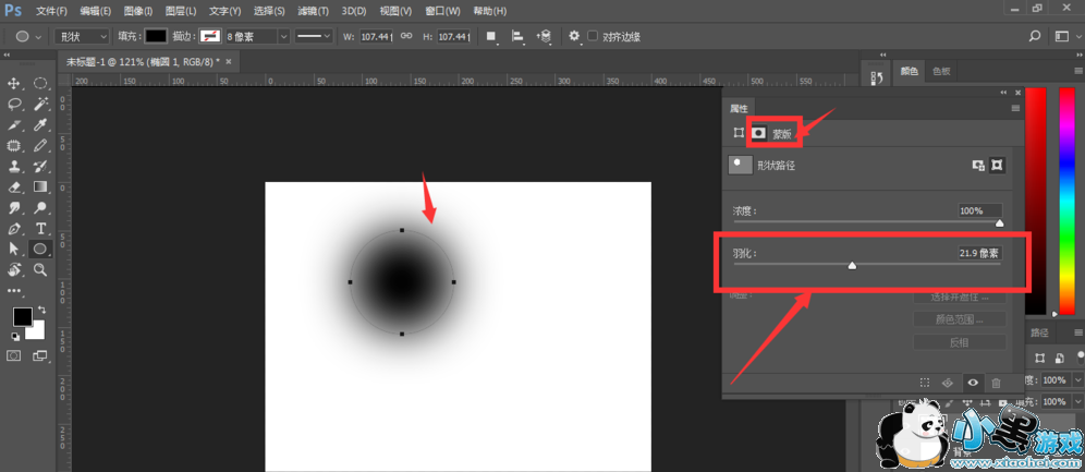 在蒙版属性中调整羽化值大小,羽化值越大,图形越模糊,
