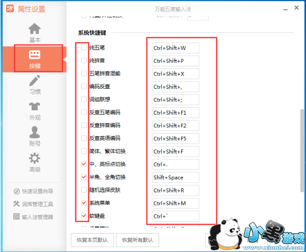 3、在“设置属性”的“按键”界面中就可以看到万能五笔输入法的所有快捷键了,想要使用哪个只需勾选上它即可;