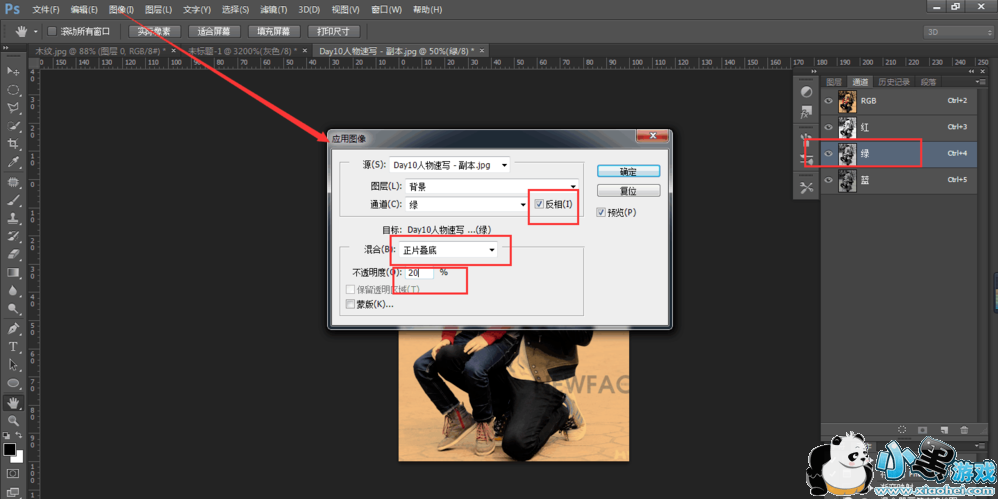 选择绿色通道,点击图像——应用图像,设置参数,如图所示;