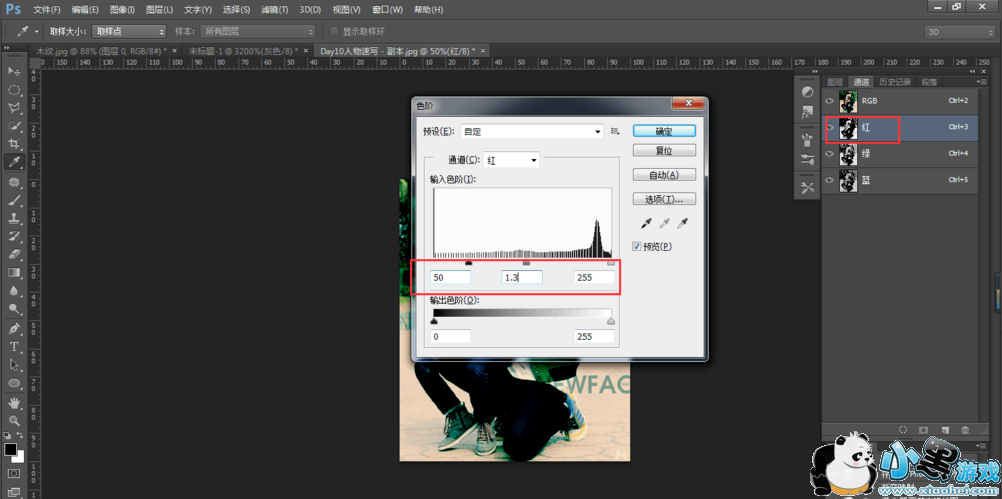 选择红色通道,点击图像——调整——色阶,设置参数,如图所示;
