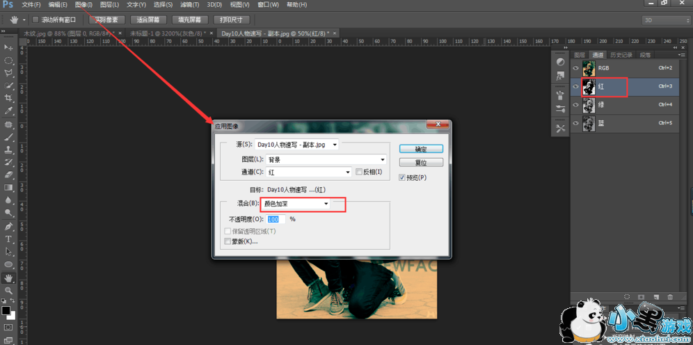 选择红色通道,点击图像——应用图像,设置参数,如图所示;