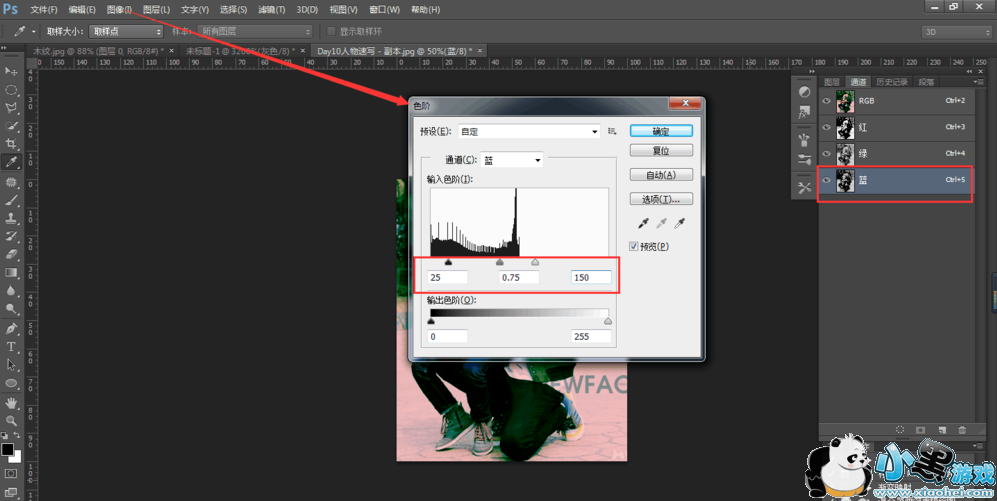 选择蓝色通道,点击图像——调整——色阶,设置参数,如图所示;