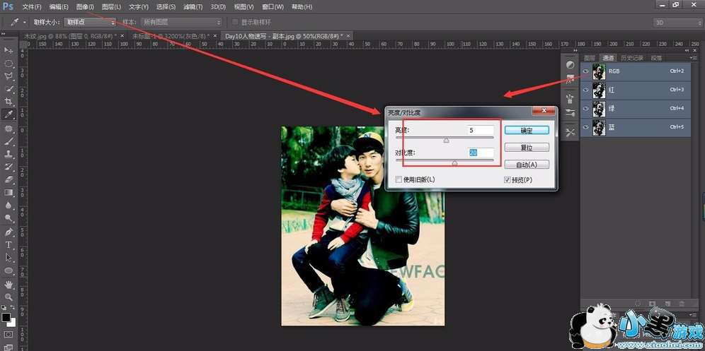 选择RGB通道,点击图像——调整——亮度/对比度,设置参数,如图所示;