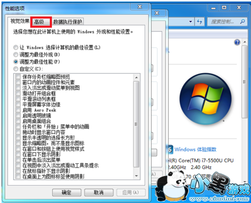 在弹出来的页面中点击【高级】,点击性能下方的【设置】按钮。