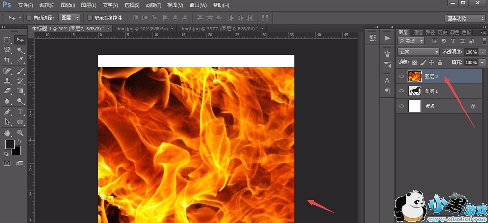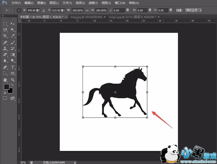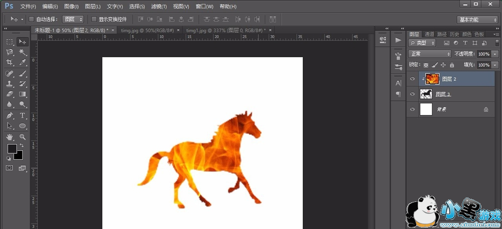 将马形状的图片拖入到白色画布中,用“ctrl+T”调整其大小,然后将火焰图层拖入进来。