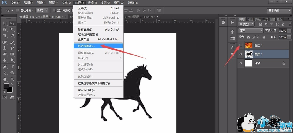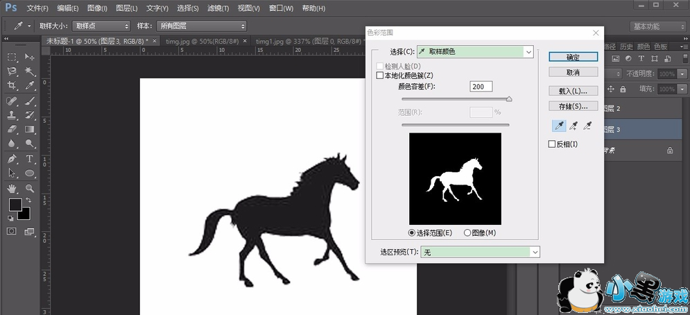 接着隐藏火焰图层,用“选择”菜单下的“色彩范围”将马图形选出。