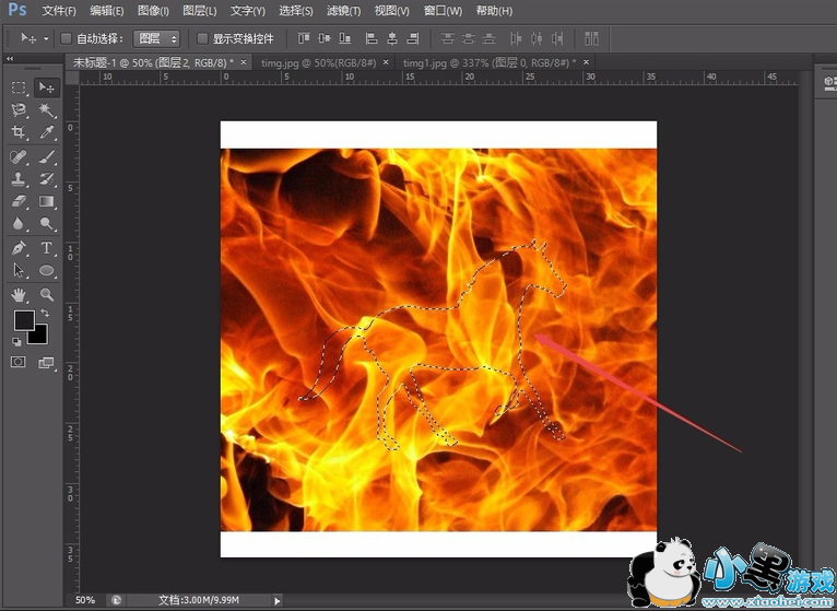 这时可以看到一个马形状的选区,再将火焰图层显示出来,就能看到火焰图层上的马形选区。