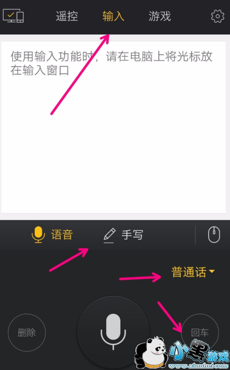 打开输入页面,我们可以看到语音、手写两种方式,选择普通话、粤语、四川话、英语四个选项,点击回车选项,可以控制鼠标,