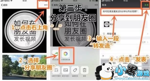 第四步:最后,将“长视频”分享到朋友圈,之后的操作是点击右上角“…”,然后选择“分享朋友圈”,然后再输入一段“转发语”,最后点击右上角“发表” 就可以了。