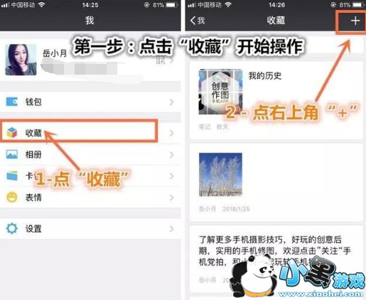 第一步:首先在手机中打开微信,然后在“我的”界面中,点击“收藏”,之后再点击右上角“+”号,如下图所示。