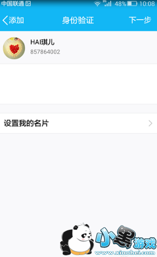 4、点击添加,就进去了身份验证界面,填写信息就可以,点击下一步,将好友放在哪,或者备注