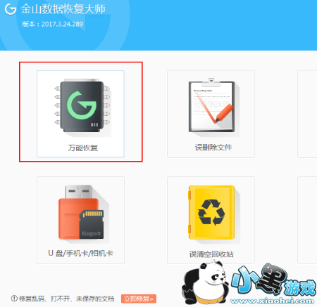 1、首先打开金山数据恢复大师,然后在其界面打开“万能恢复”功能;