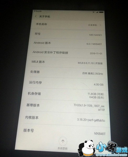 微博有网友曝光了一张图,显示新机信号为“MIX NANO”,采用2.35GHz处理器,内置4GB内存和64GB机身存储,运行Android 6.0.1系统。