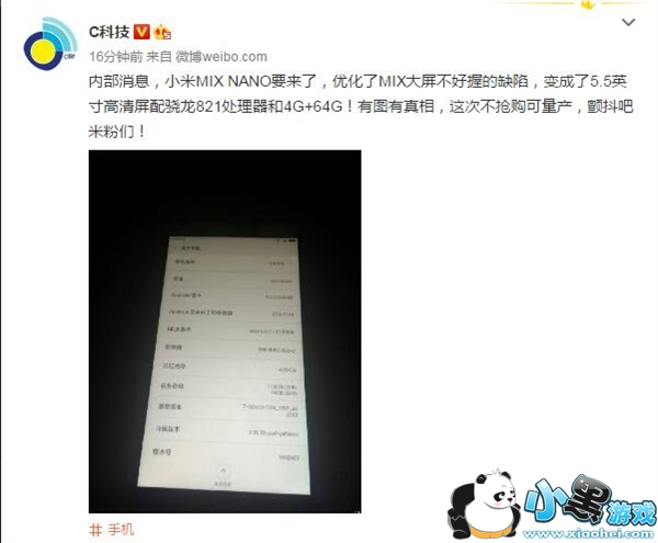该网友还表示,内部消息,小米MIX NANO优化了MIX大屏不好握的缺陷,变成了5.5英寸高清屏配骁龙821处理器!有图有真相,这次不抢购可量产,颤抖吧米粉们!