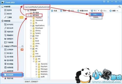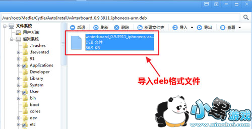 将苹果手机与电脑连接,打开iTools,点击文件系统-越狱系统,打开文件路径:/var/root/Media/Cydia/AutoInstall,将deb格式文件导入到该文件夹当中。