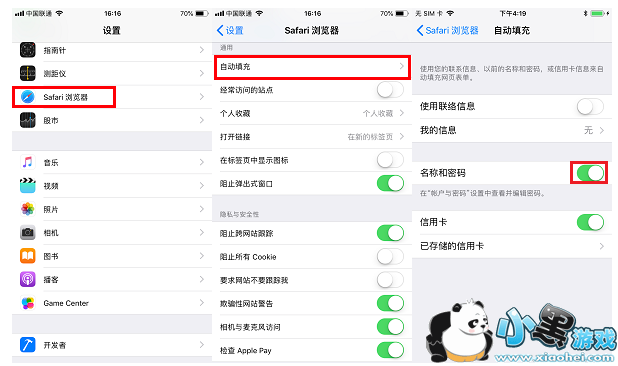 首先我们需要打开密码填充功能,在【设置】-【Safari浏览器】中,选择【自动填充】,将【名称和密码】开关打开。