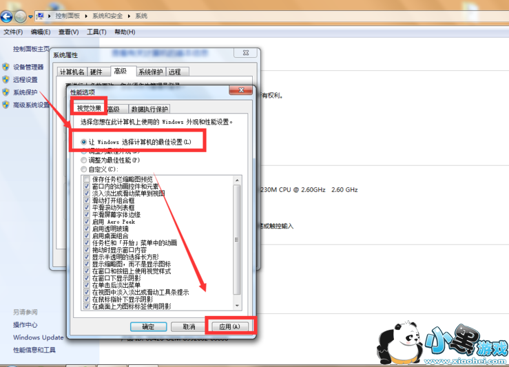 然后会弹出一个性能选项页面,点击打开视觉效果,选择第一个设置,点击应用。此时,电脑会进入短暂的卡顿,等待字体设置完成后,点击确定关闭选项面板,返回界面看字体是否恢复正常。