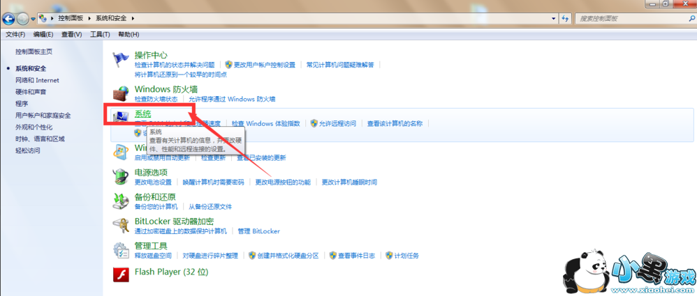 进入系统和安全面板,在右侧的菜单中点击选择系统,如图,