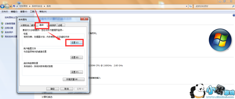进入系统属性页面,点击打开高级——设置选项,