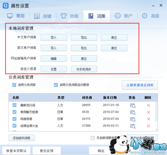 3、在属性设置界面找到“词库”分类,接着在“本地词库管理”中就可以导入或者导出词库了。