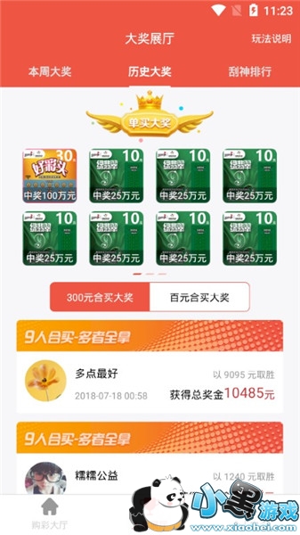 2、大奖展厅里可以看到历史大奖本周大奖以及刮神排行,可以看到信息。