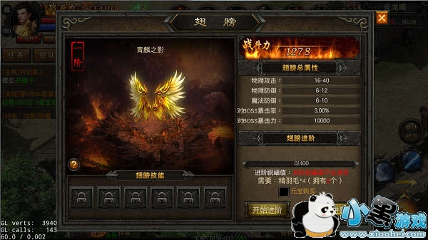 2)打开翅膀按钮,可进入翅膀的面板。玩家可使用羽毛来升级翅膀的等级,从而提升角色的战斗力