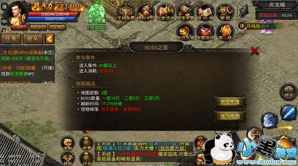 1)Boss之家:VIP玩家可在炎龙城与Boss之家NPC对话进入Boss之家综合打宝地图,Boss之家分三层,每层Boss数量不一致。在击杀Boss后。会掉落装备、材料等道具与大量经验与金币