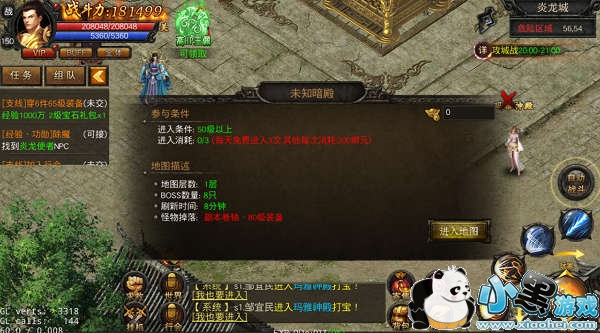 3)未知神殿:玩家等级在达到50级后,可在炎龙城与转生神殿NPC对话进入转生神殿打宝地图。击杀BOSS掉落 装备、经验、材料、道具。每天有3次免费进入神殿的机会,3次之后就需要消耗绑元方能进入