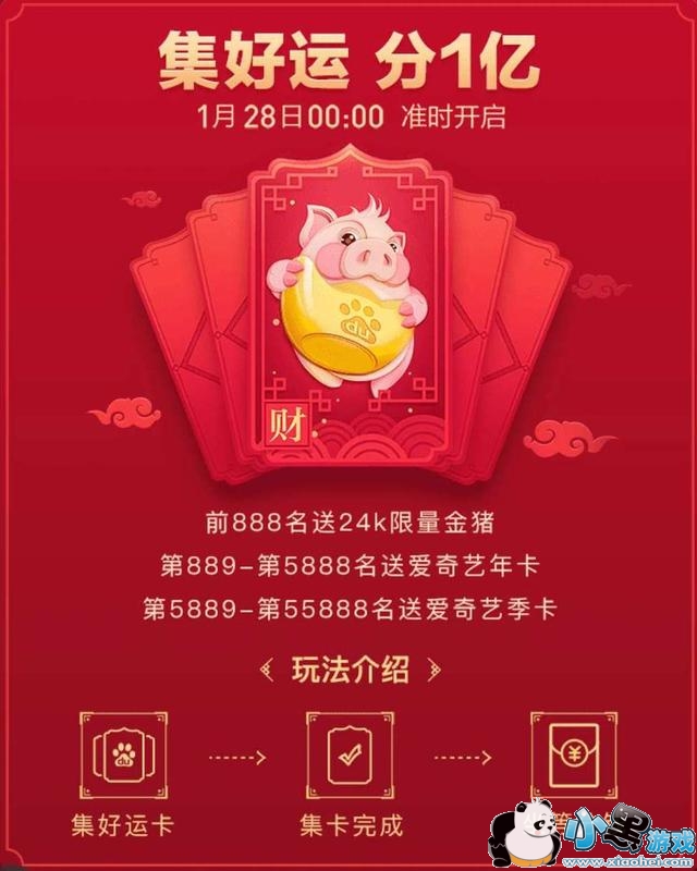 1、集好运卡瓜分一个亿:集好运卡活动将于1月28日小年夜正式拉开帷幕,排名靠前将有机会获得奖品:前888名送24K金猪;第889-5888名送爱奇艺年卡;第5889-55888名送爱奇艺季卡;