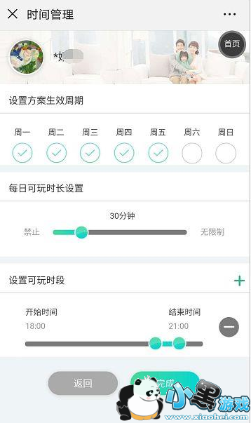 3、成功绑定孩子的微信账号之后,我们就可以从中设置微信小游戏的每日可玩时长、可玩时段、方案生效周期,非常方便快捷!