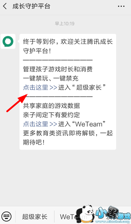 2、接下来按照官方公众号的提示,点击超链接进入“超级家长”界面(如下所示),这样就可以设置禁玩了。