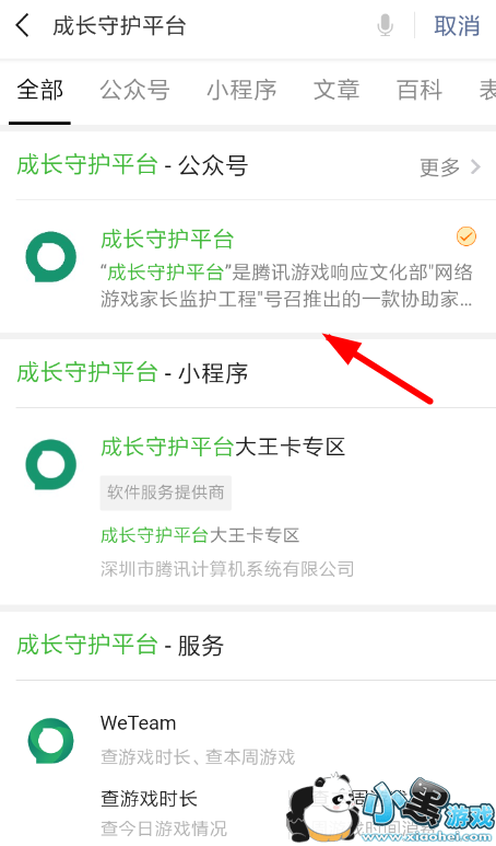 1、打开微信的软件主页之后,我们需要从中搜索“成长守护平台”的关键词,然后点击进入到公众号的详情界面,从而进行管理设置。