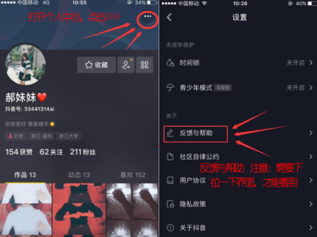 2. 进入个人页面后,点击右上角的三个点图标。在设置页面中,找到并点击“反馈与帮助”。