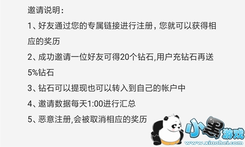 3、钻石可以提现也可以转入到自己的帐户中4、邀请数据每天1:00进行汇总5、恶意注册,会被取消相应的奖历。