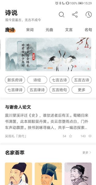 诗说软件是一款集古诗词、文言、古籍、名句、古代名家介绍等