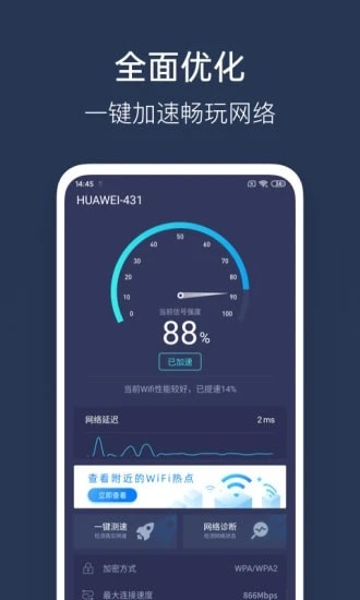 WiFi上网信号强度随时掌握,一键优化加速网络速度,让你玩游戏看视频更顺畅;