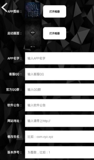 3、你需要填写APP的图标以及启动页图片,软件公告以及网站地址、包名的修改、版本序号以及版本名称等就请自行填写吧。