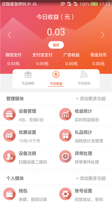 智控游乐是一款专为游戏商家提供的管理平台,能够提高的数据,这里拥有更多管理模块,其中包括设备管理、收益统计、优惠设置、礼品设计、设备注册和异常处理,这里能够显示出每天的收益,及时显示出收益的数据,清楚的看到收益的变化,了解到收益的变化,并且还提供了多个端口接收的形式,微信、支付宝广告以及现金兑换,让个人钱包以及收益明细更精准,支持提现操作,显示出可提现的余额,点击提现,即可输入提现金额,快速提现操作,还能够记录出提现的记录,让收益更准确。智控游乐app是一款帮助游艺机商家轻松进入o2o、接轨互联网的一款引领游艺机行业物联网一体管理产品,能远程查看、设置和管理机台运行状态。一个app即可以管理所有机器,随时随地掌握机器管理营收,礼品消耗情况,线上支付情况,广告营收和现金兑币情况。