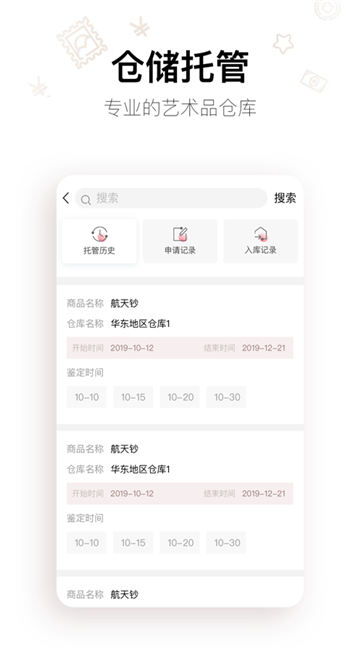 4、鉴定托管:客户在app预约鉴定,到线下鉴定公司对自己的商品进行鉴定,鉴定后可托管至「艺仓易货」合作的第三方仓储公司