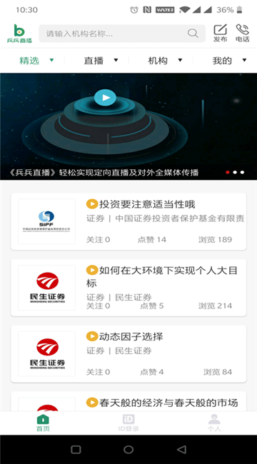 兵兵直播app是一款提供云直播技术服务的软件,提供企业级视频直播服务,能够在线上完成网络教育直播的学习,可以线上观看或制作专属的影视节目,这里推荐了精选课程,用户选择视频就可以迅速播放视频,同时学习到相关的知识,提升自己的认识;根据公开视频的推荐,线上就能找到系统推送的精彩视频,这样就能观看到更多有趣的视频,用户线上自由选择机构,迅速就能搜索出该机构的视频,根据介绍还能充分了解到机构的介绍内容,浏览相关视频,立即就能得到系统推送的视频。